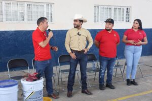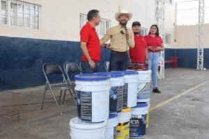 En la escuela primaria Lázaro Cárdenas de la cabecera municipal, Humberto Jiménez realizó la entrega de pintura para mejorar las instalaciones del plantel, beneficiando directamente a las y los estudiantes.